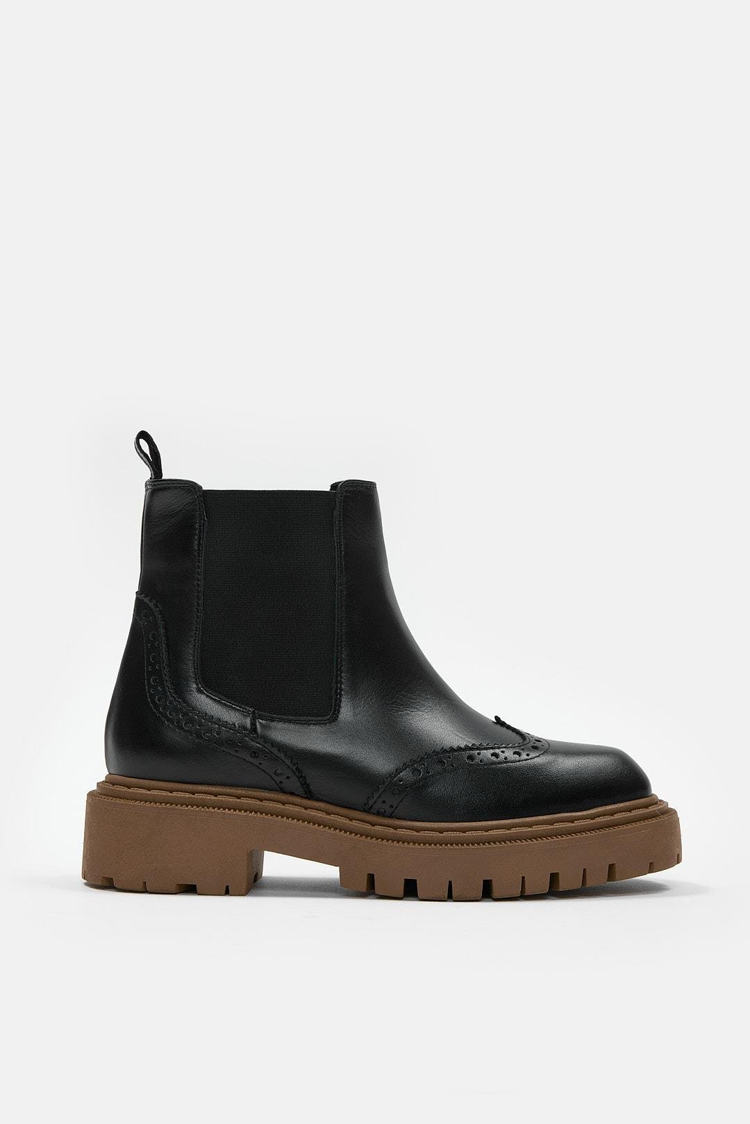 Siyah Deri Yan Kısımları Lastikli Taba Tabanlı Kadın Bot