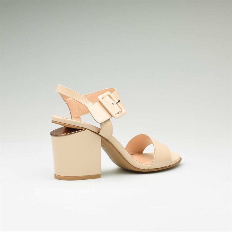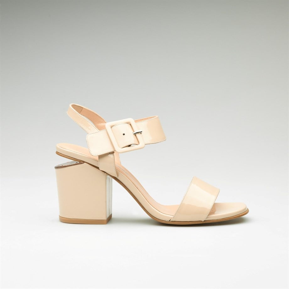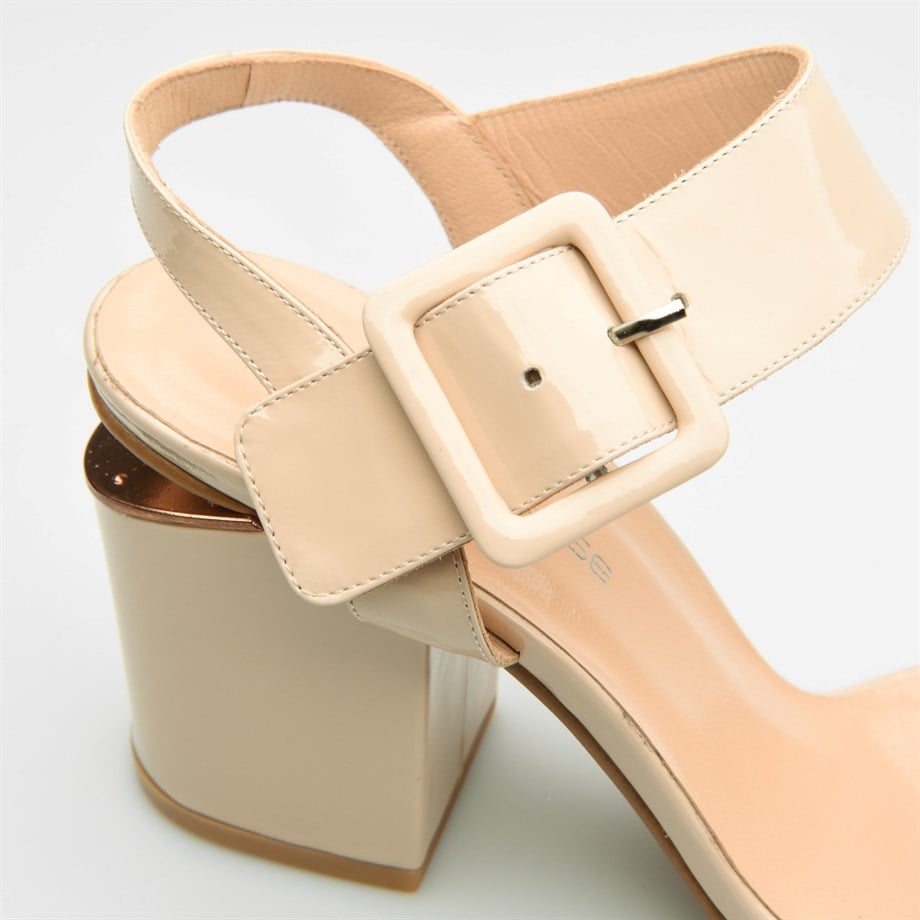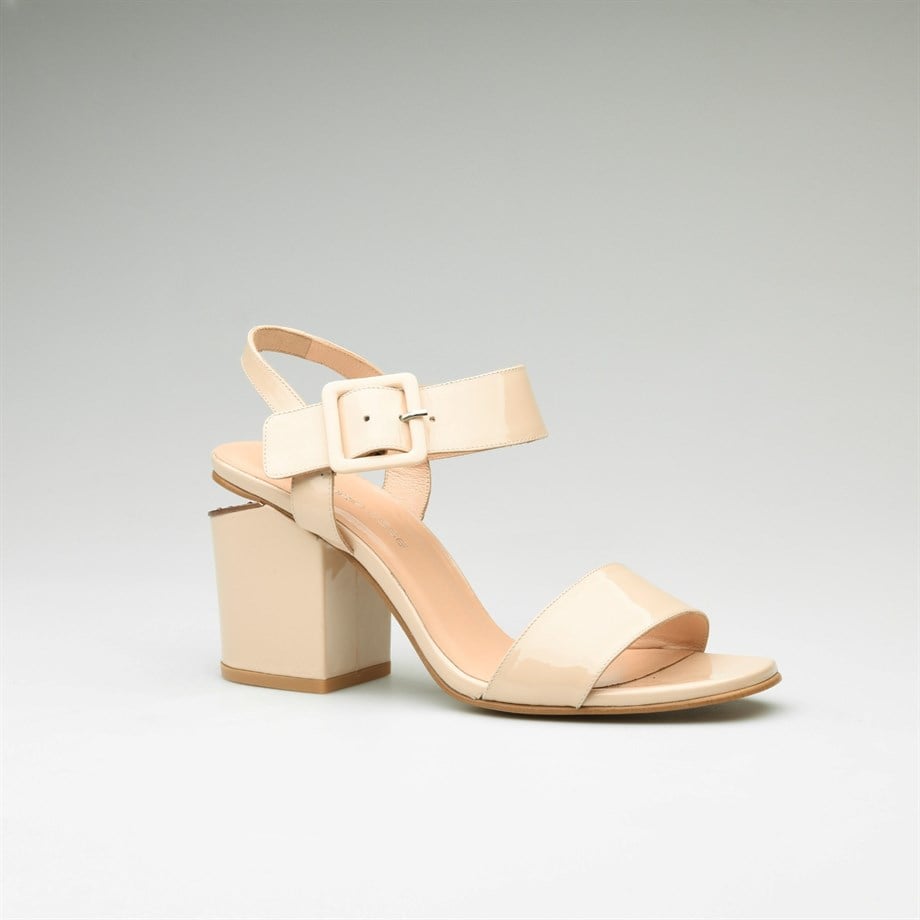 Genuine leather short-heeled women's sandals with tan patent leather inner lining.