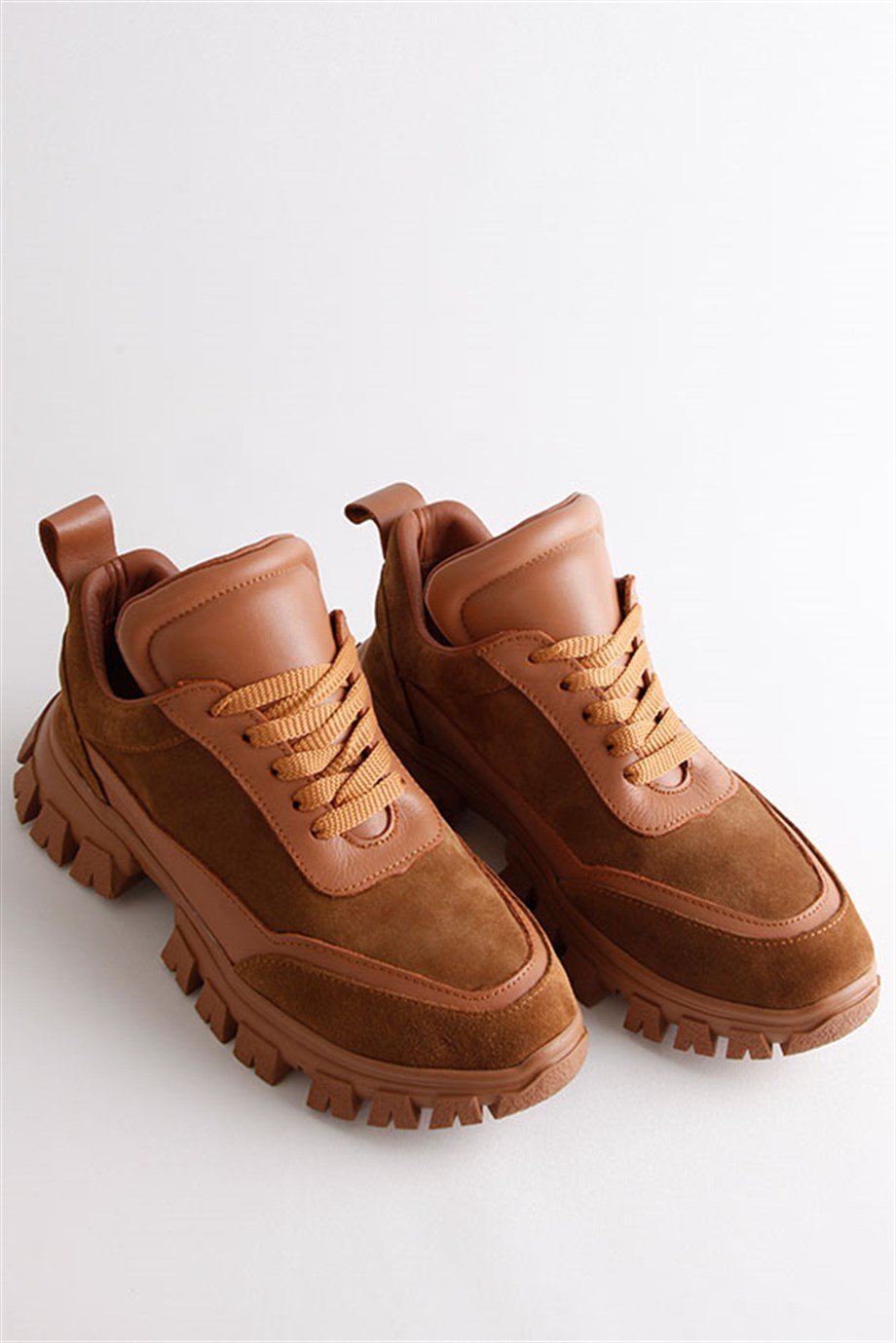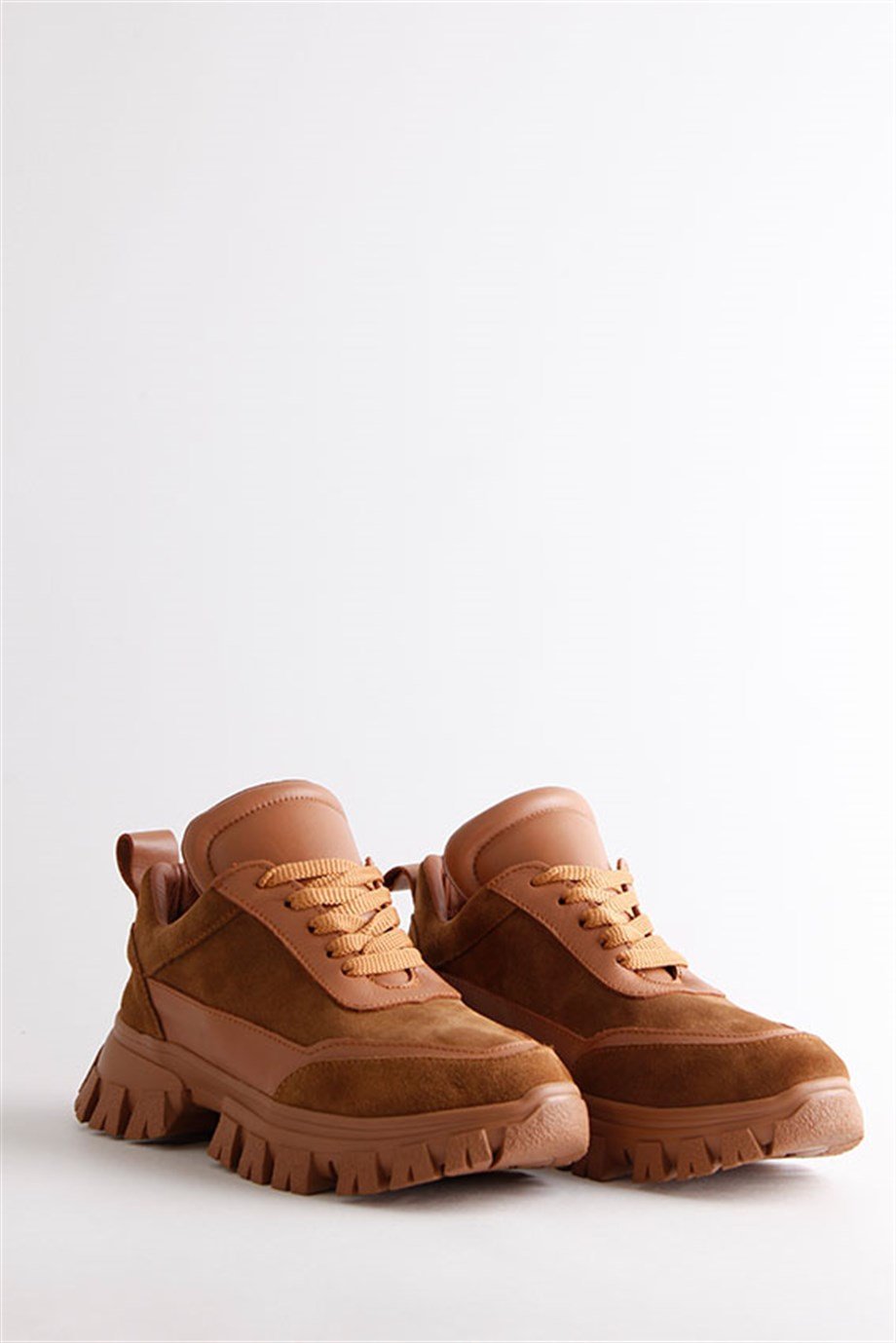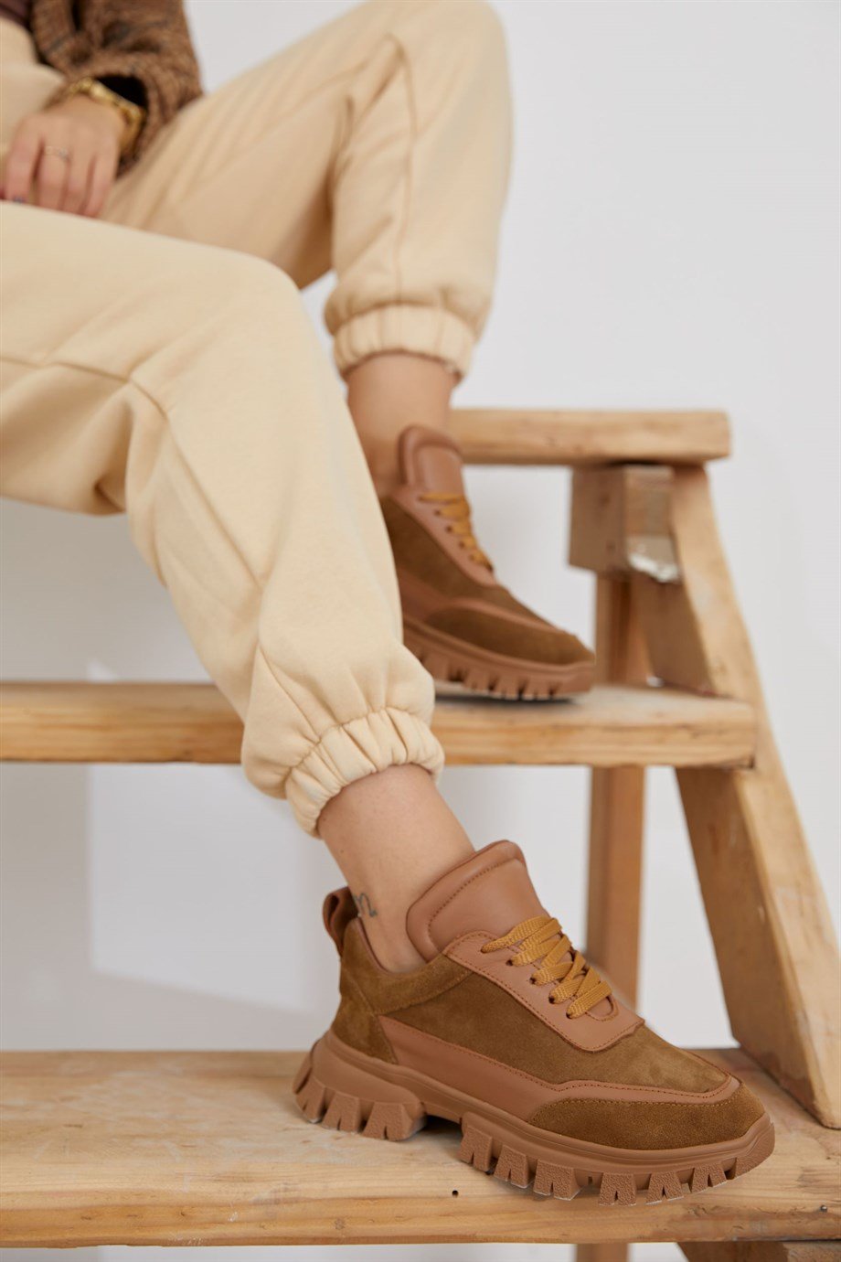 Brown leather, brown suede combination lace-up leather women's sneakers.