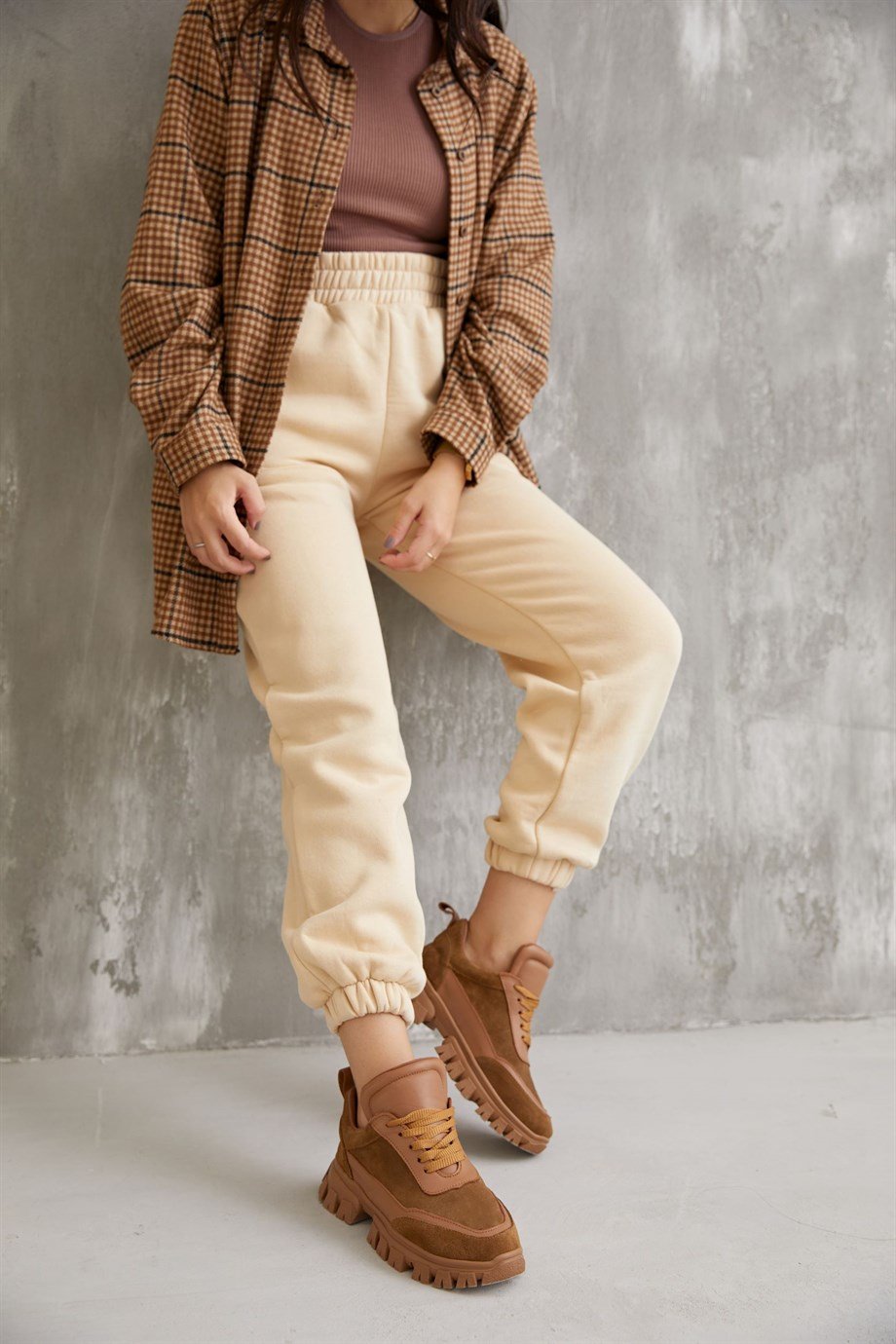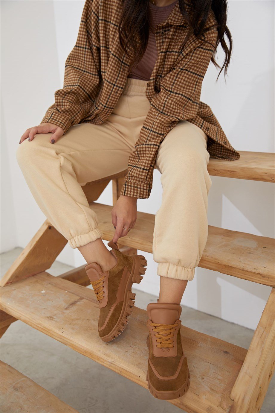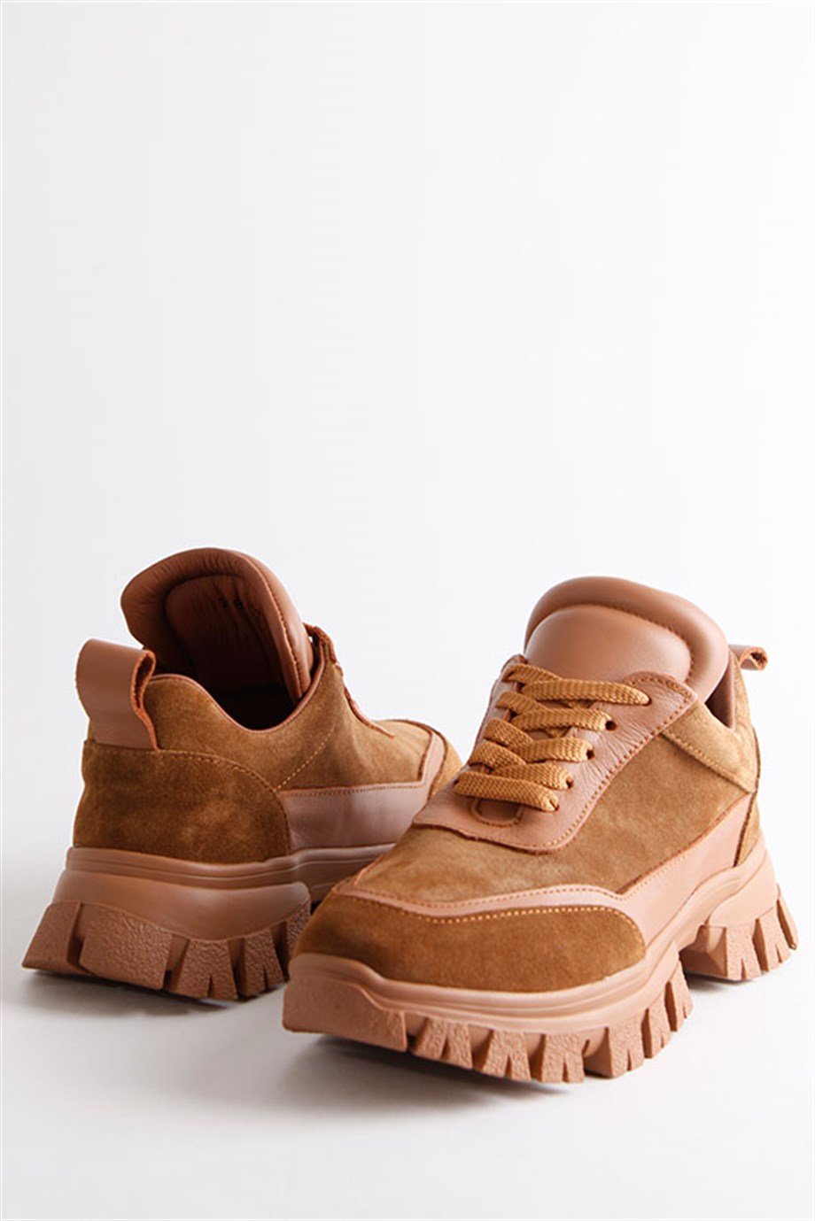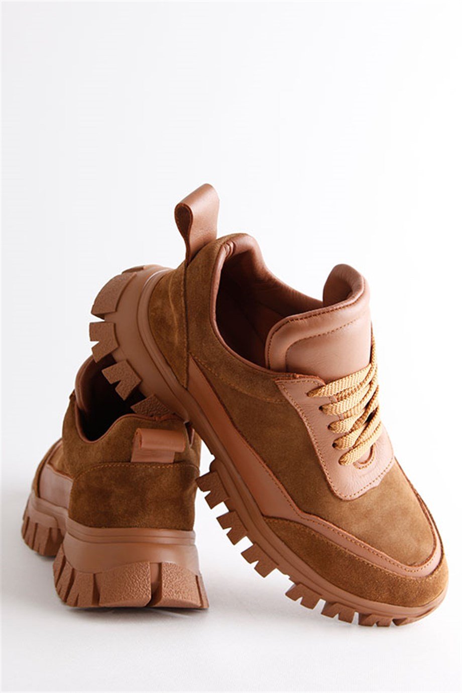 Brown leather, brown suede combination lace-up leather women's sneakers.