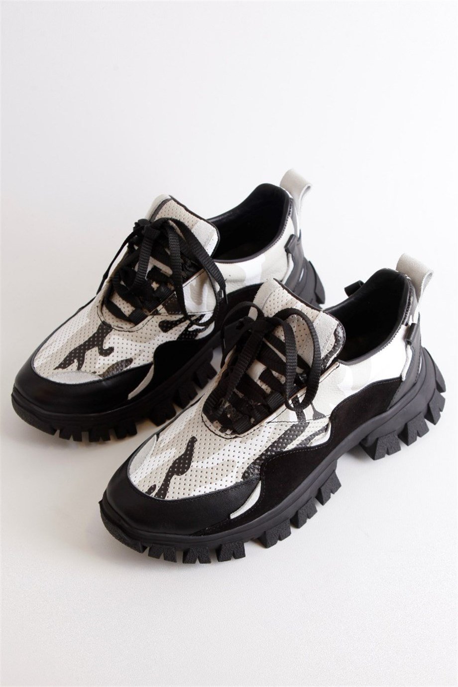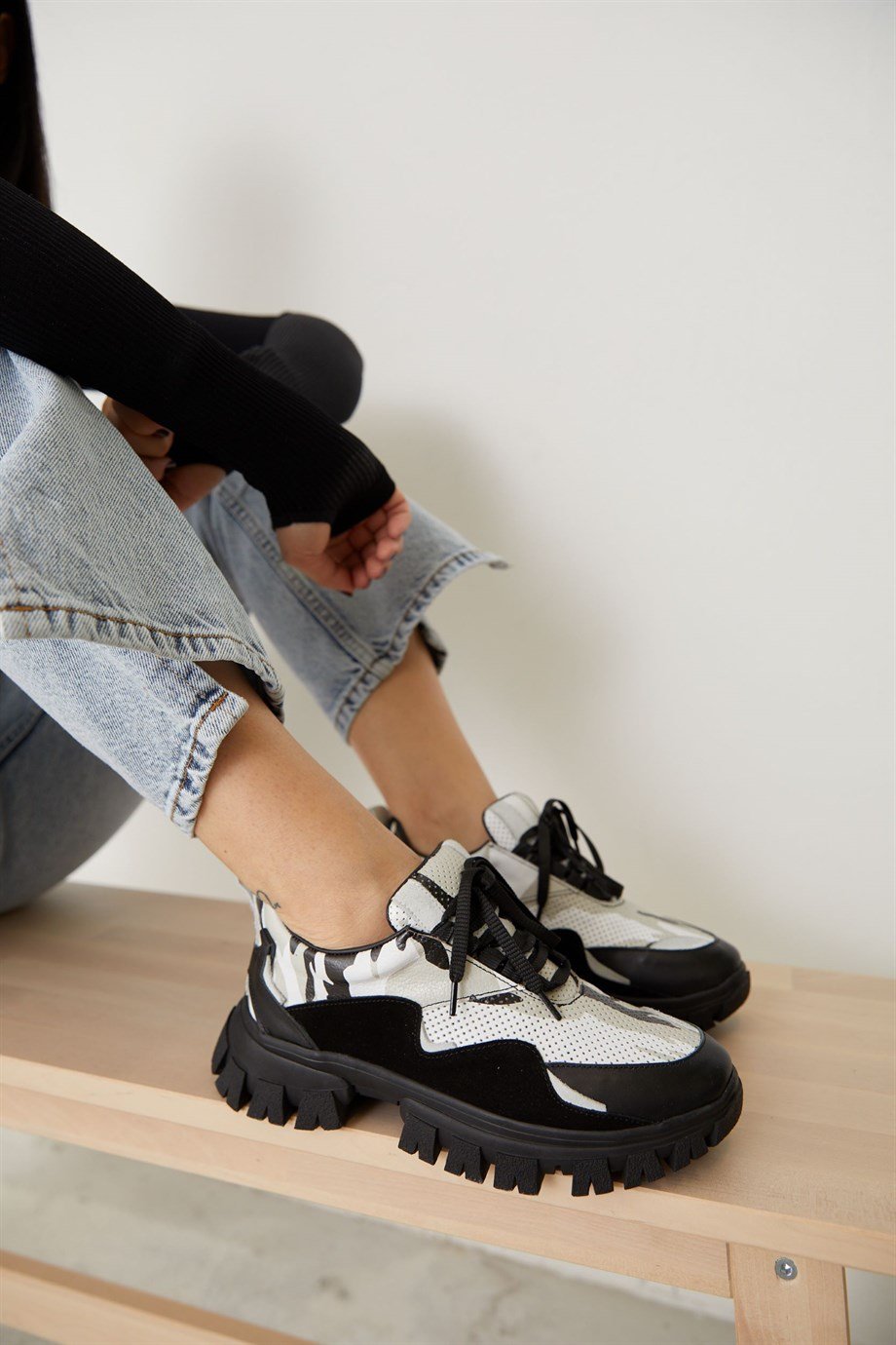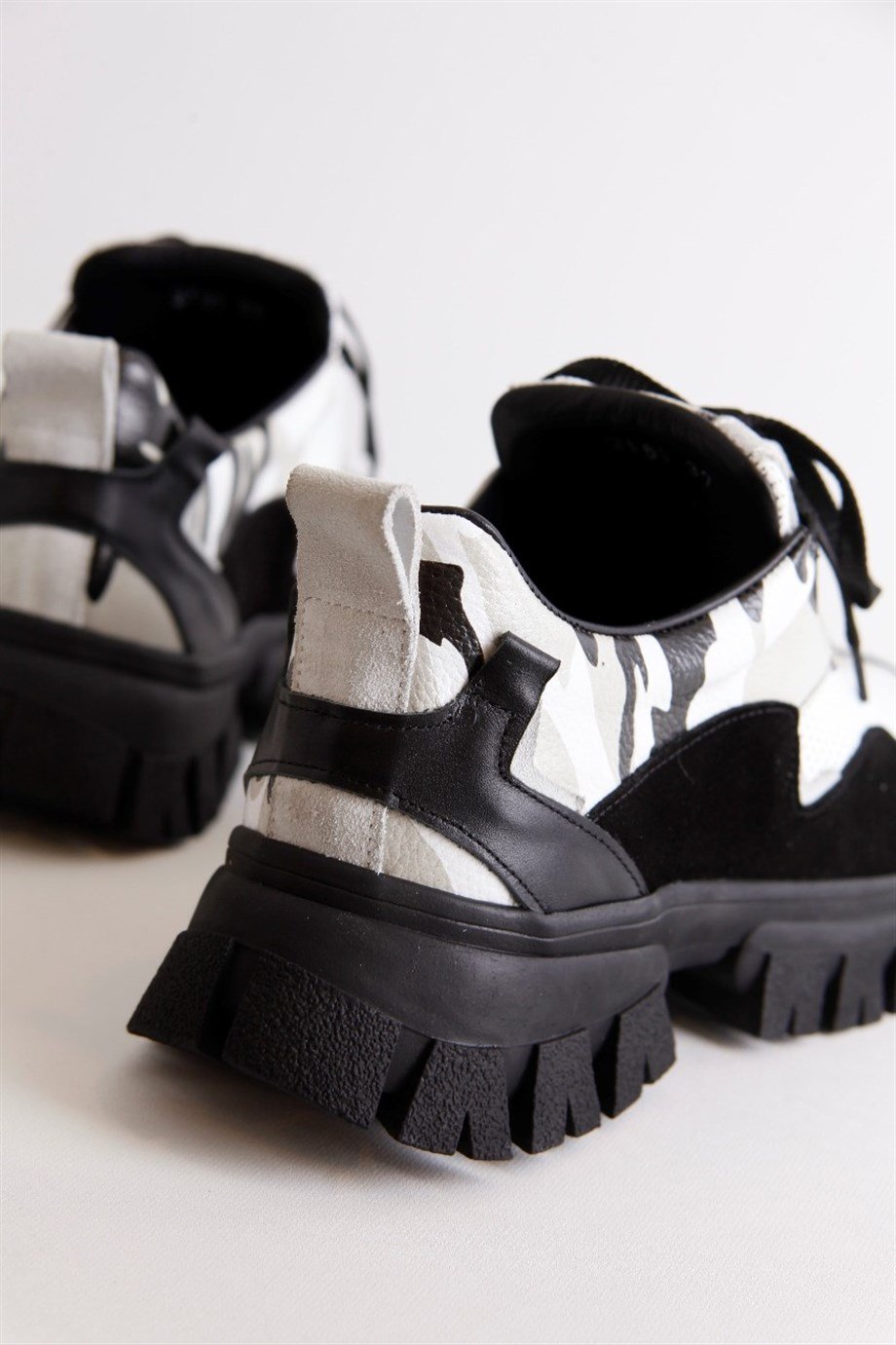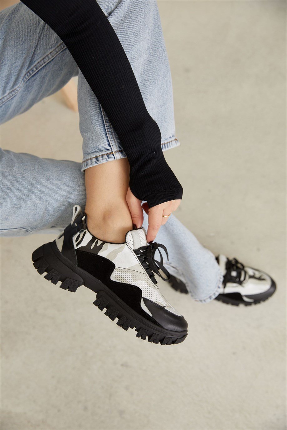 Black leather, black suede transition camouflage pattern lace up leather women's sneakers.