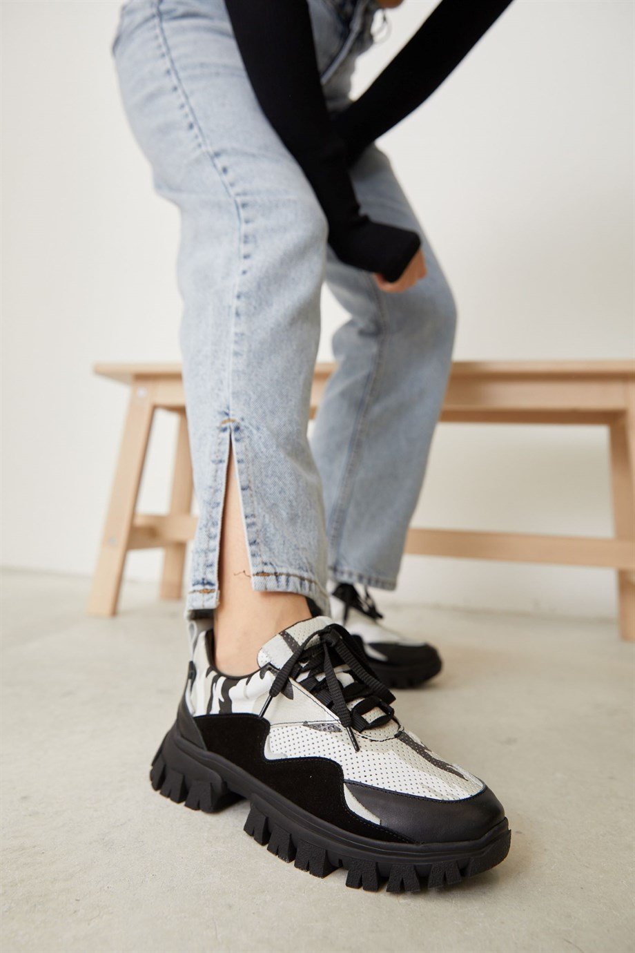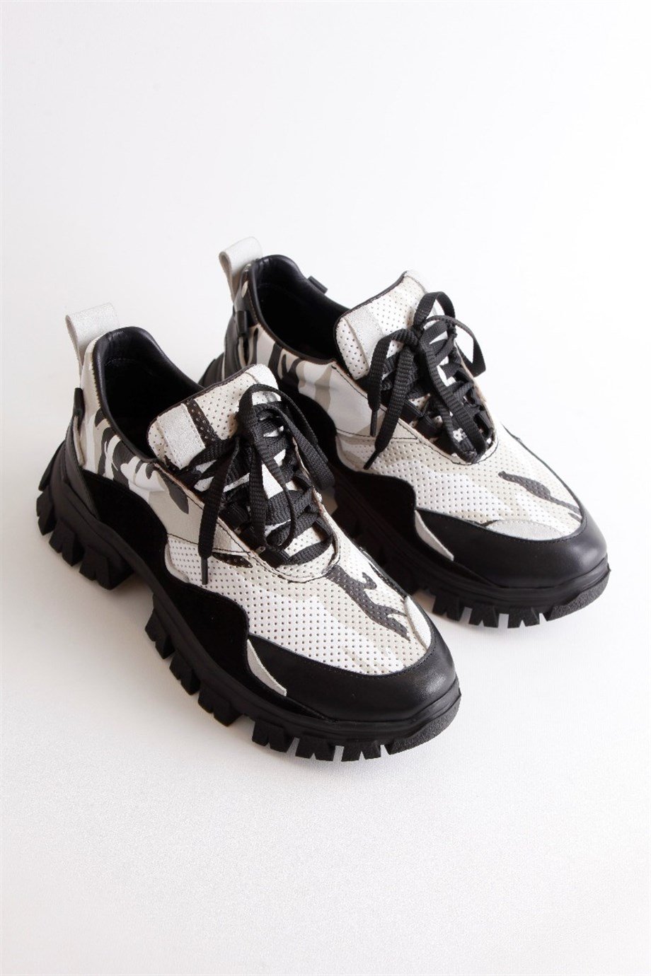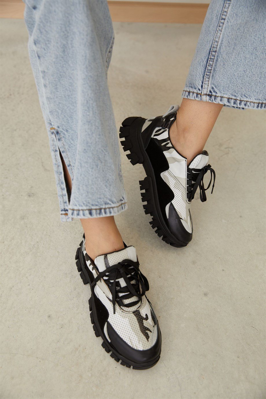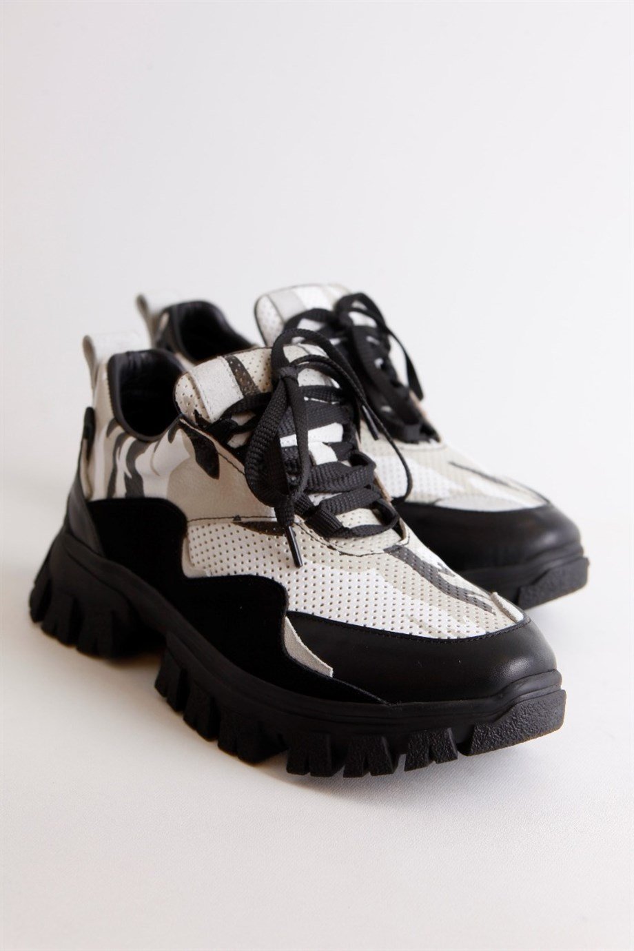 Black leather, black suede transition camouflage pattern lace up leather women's sneakers.