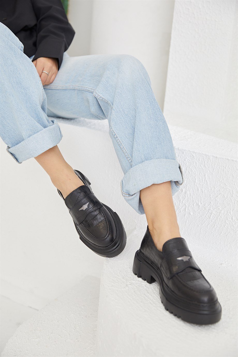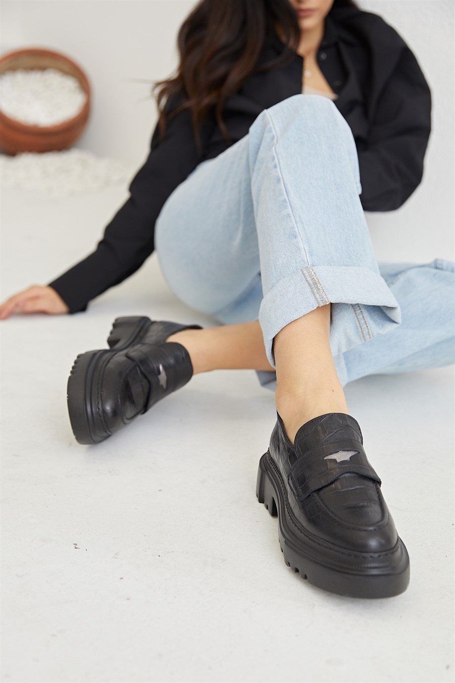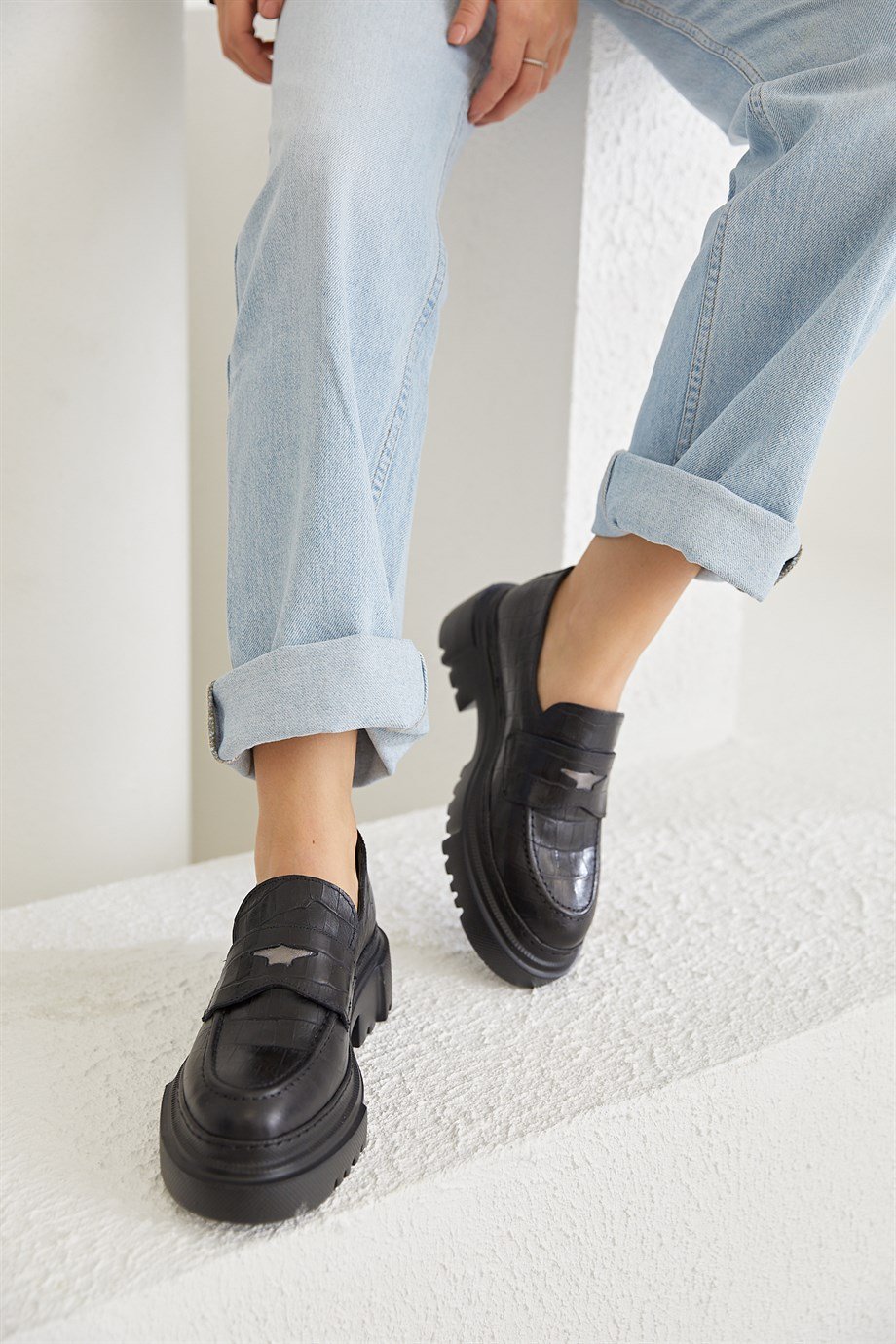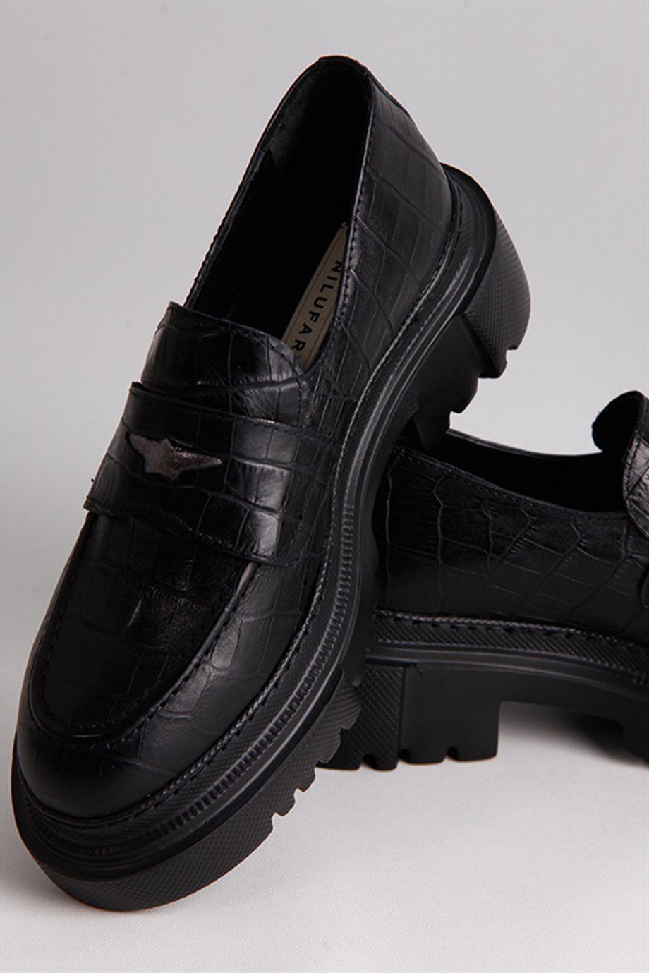 Black Crocodile Patterned Thick Sole Women's Loafers.