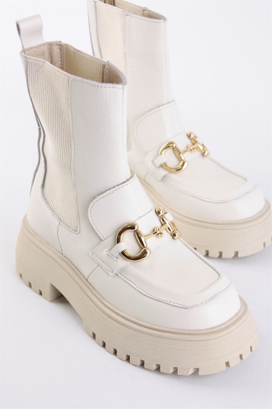 Beige Leather, Gold Buckle Accessory Elastic Sides, Thick Sole Women's Boots