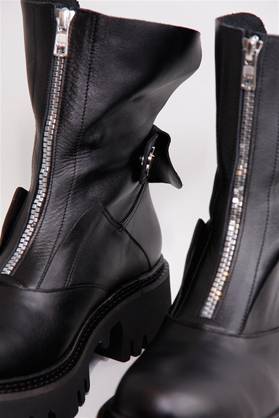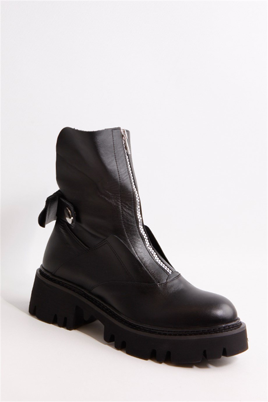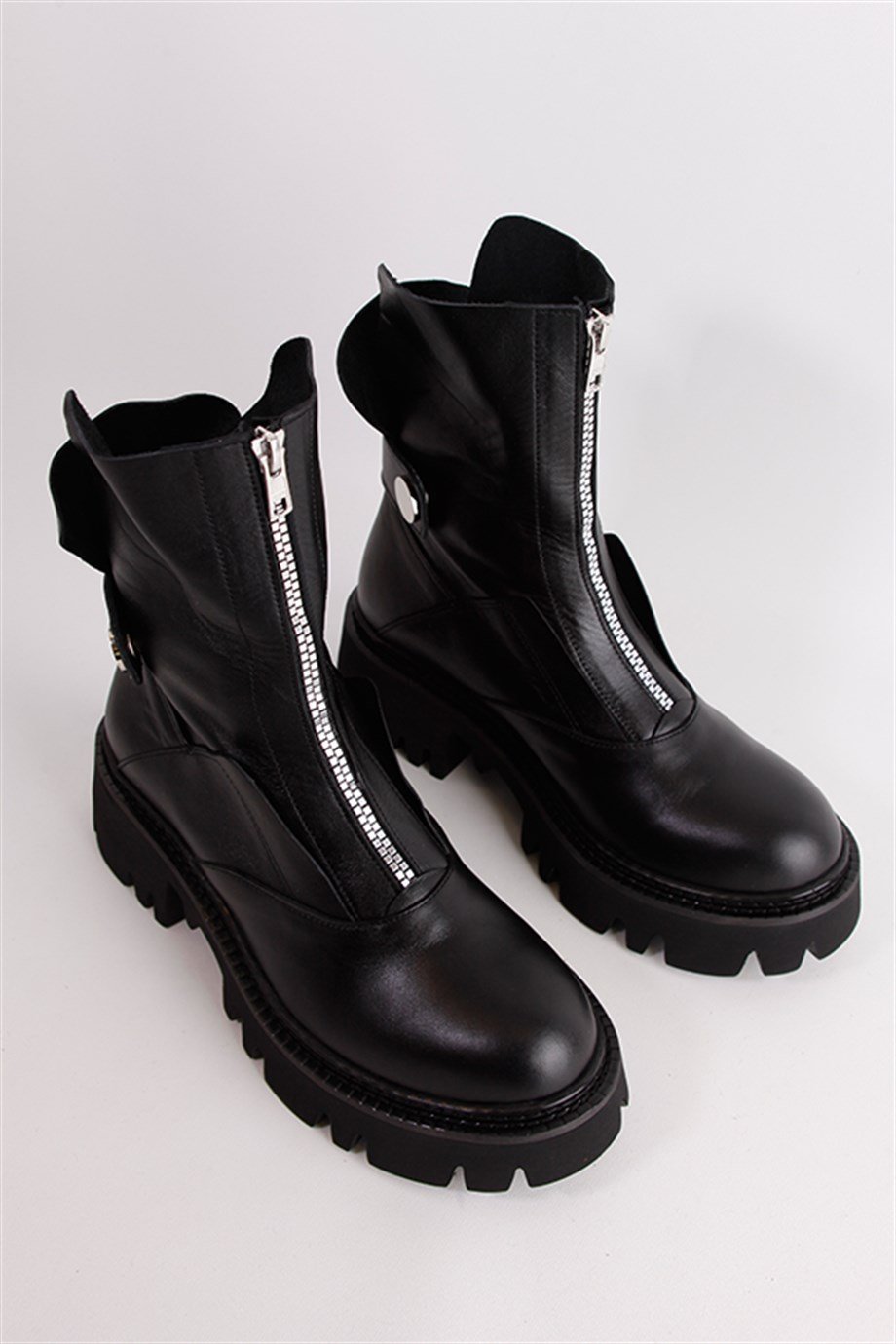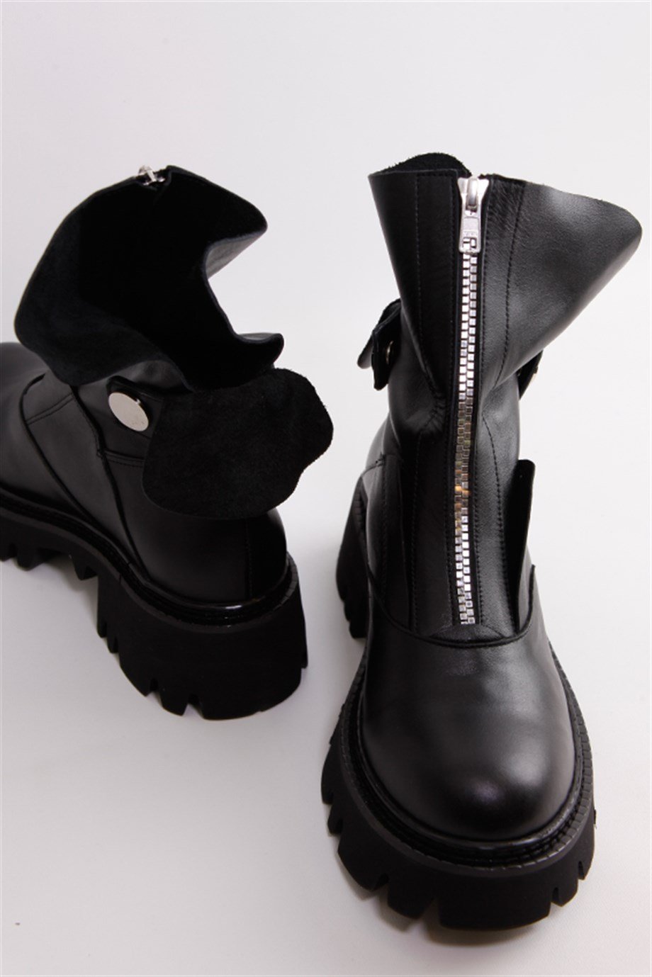 Black Leather Front Zippered Thick Soled Women's Boots.