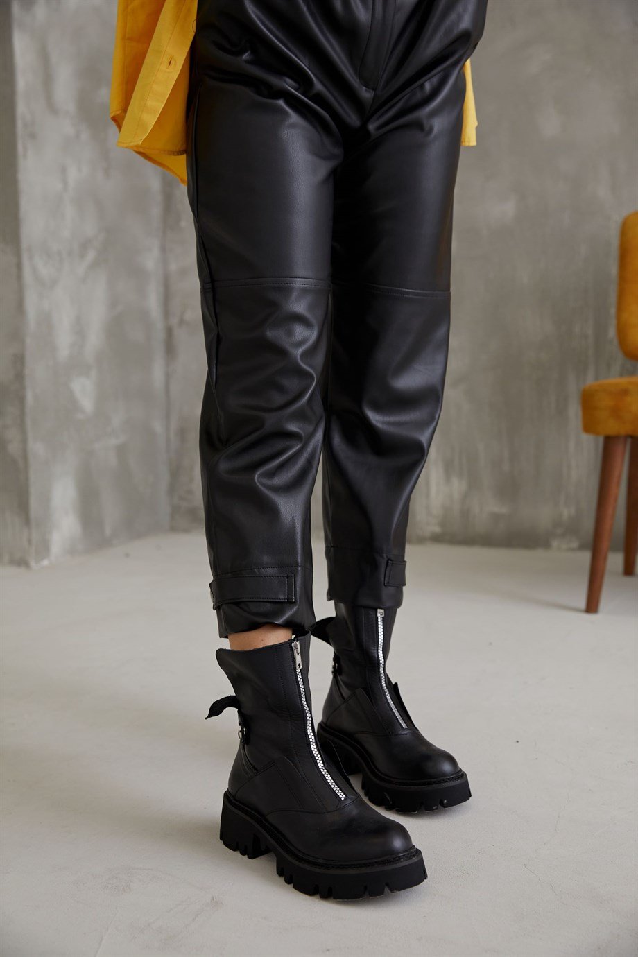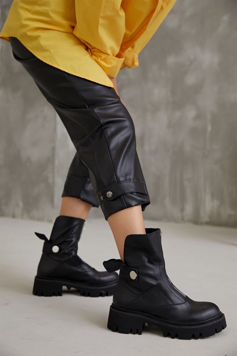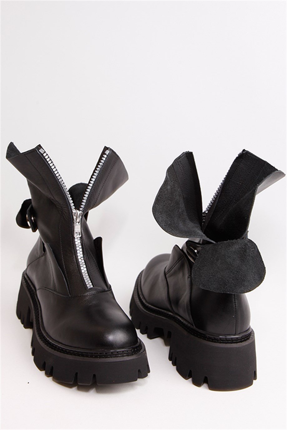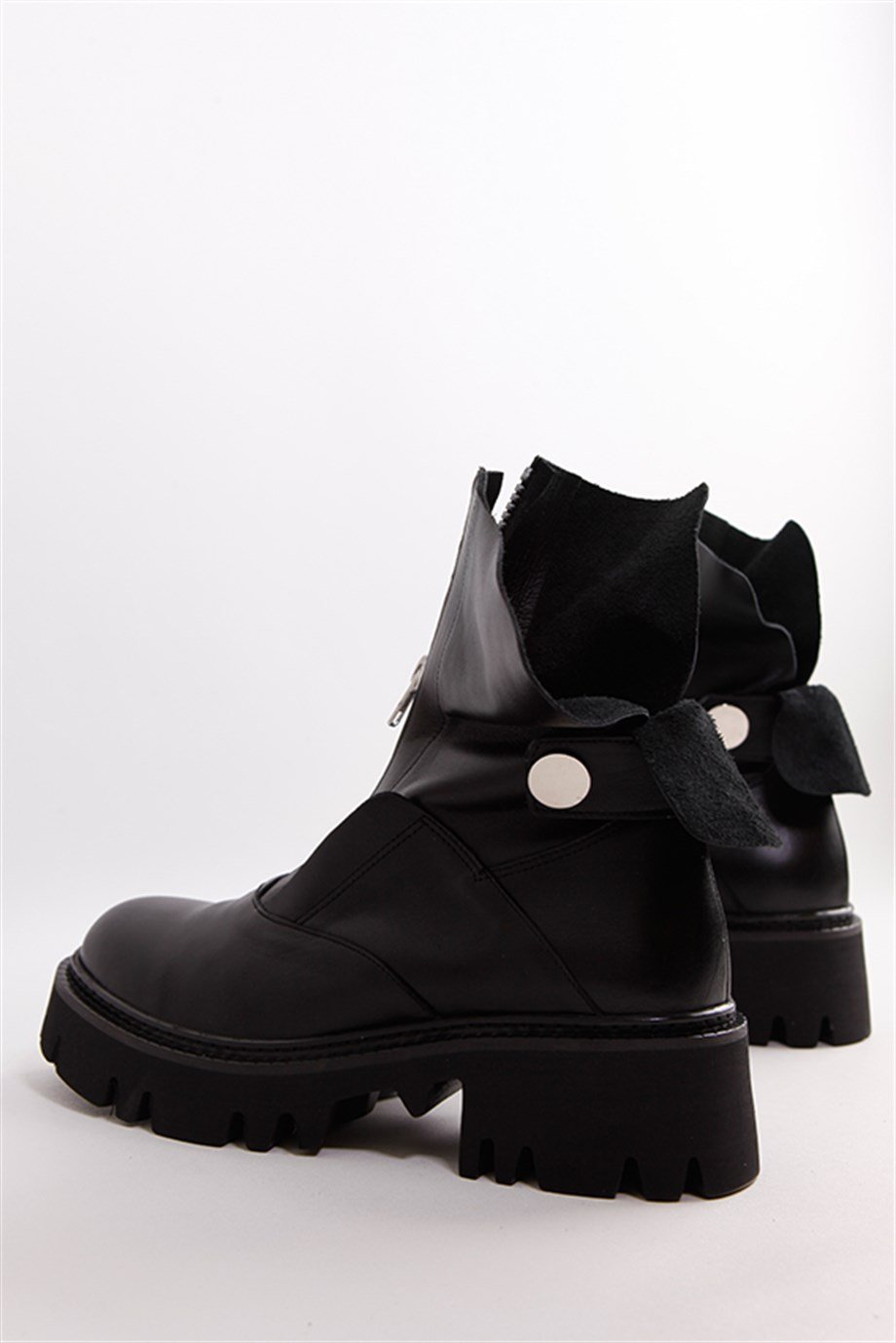Black Leather Front Zippered Thick Soled Women's Boots.