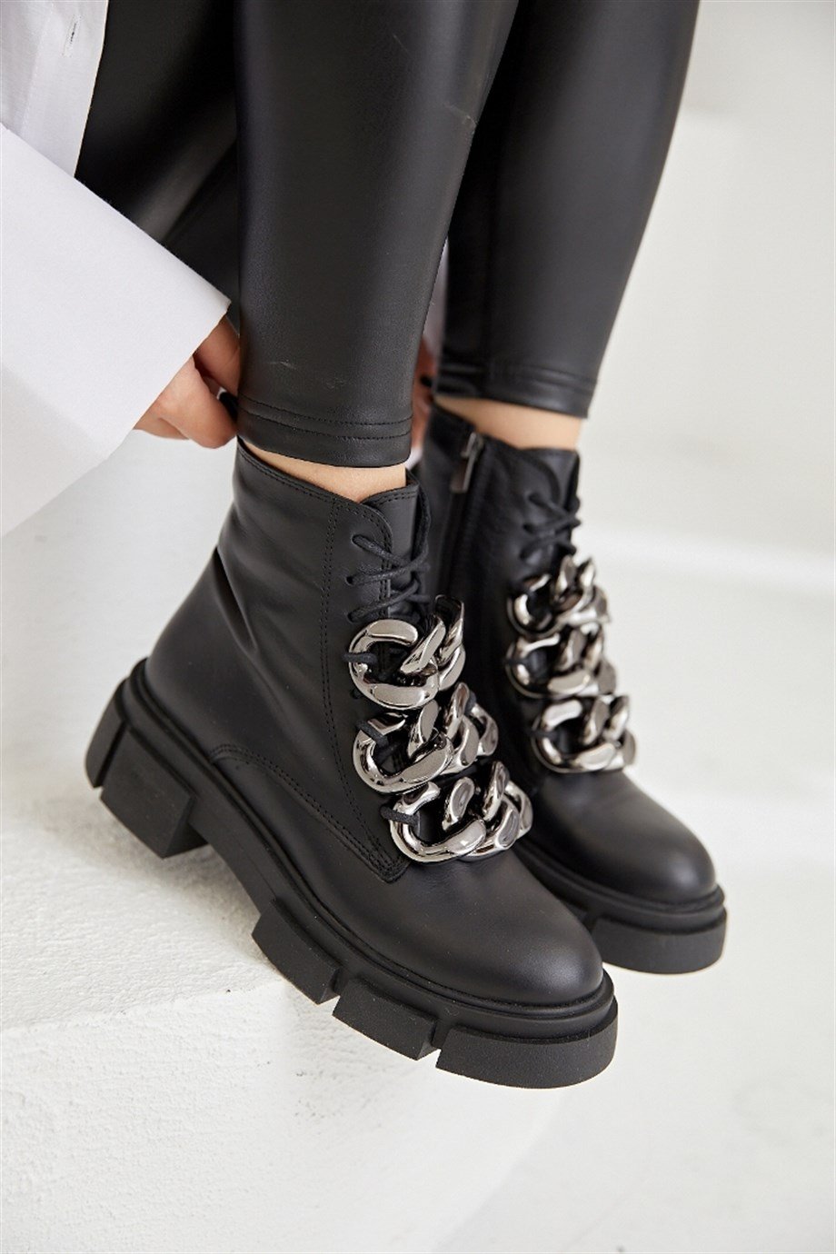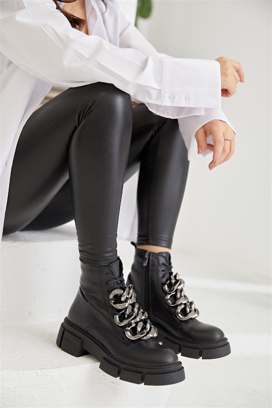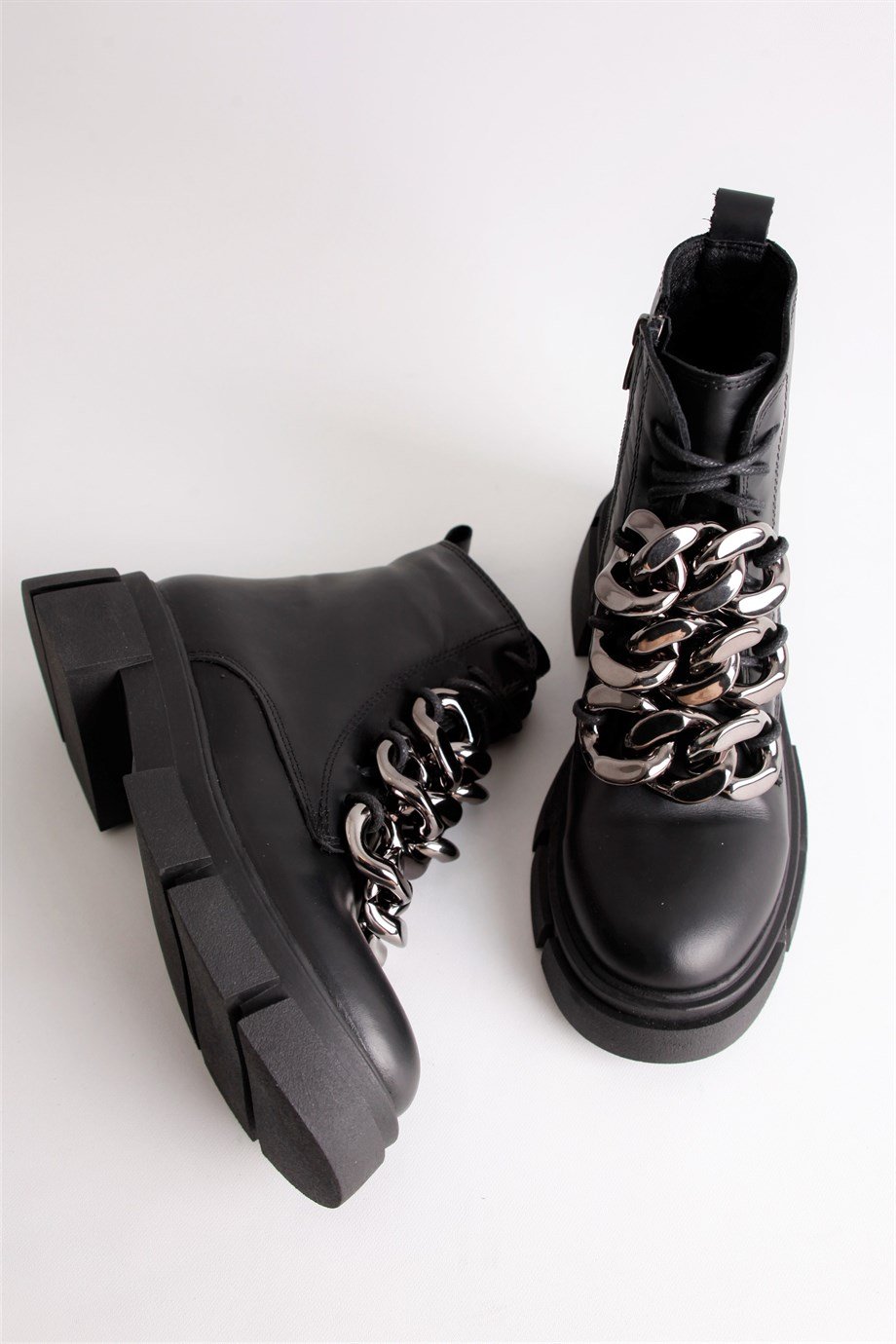 Women's Black Leather Chain Accessory Side Zipper Boots.