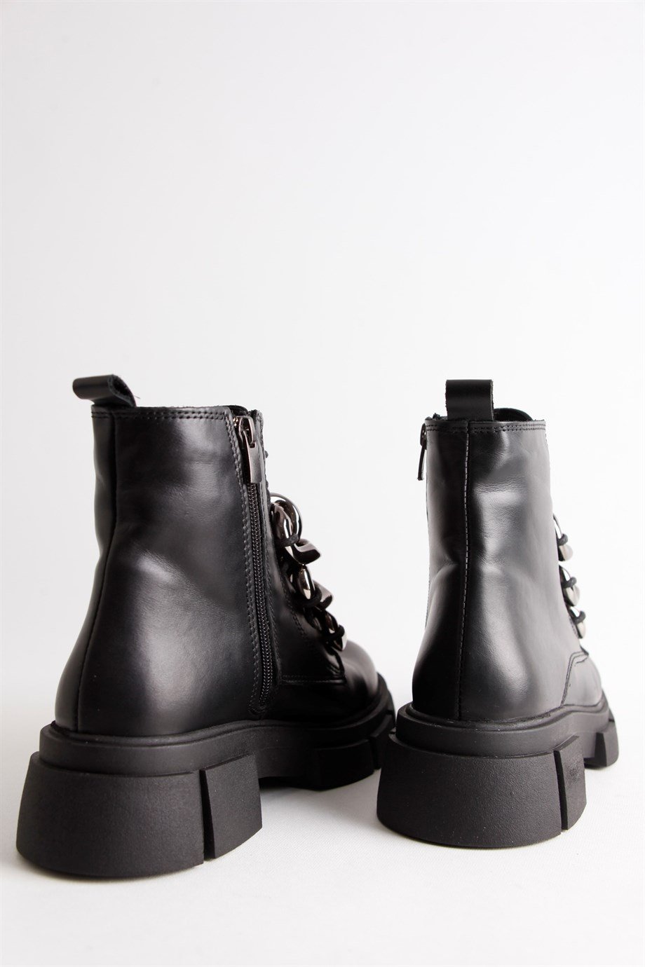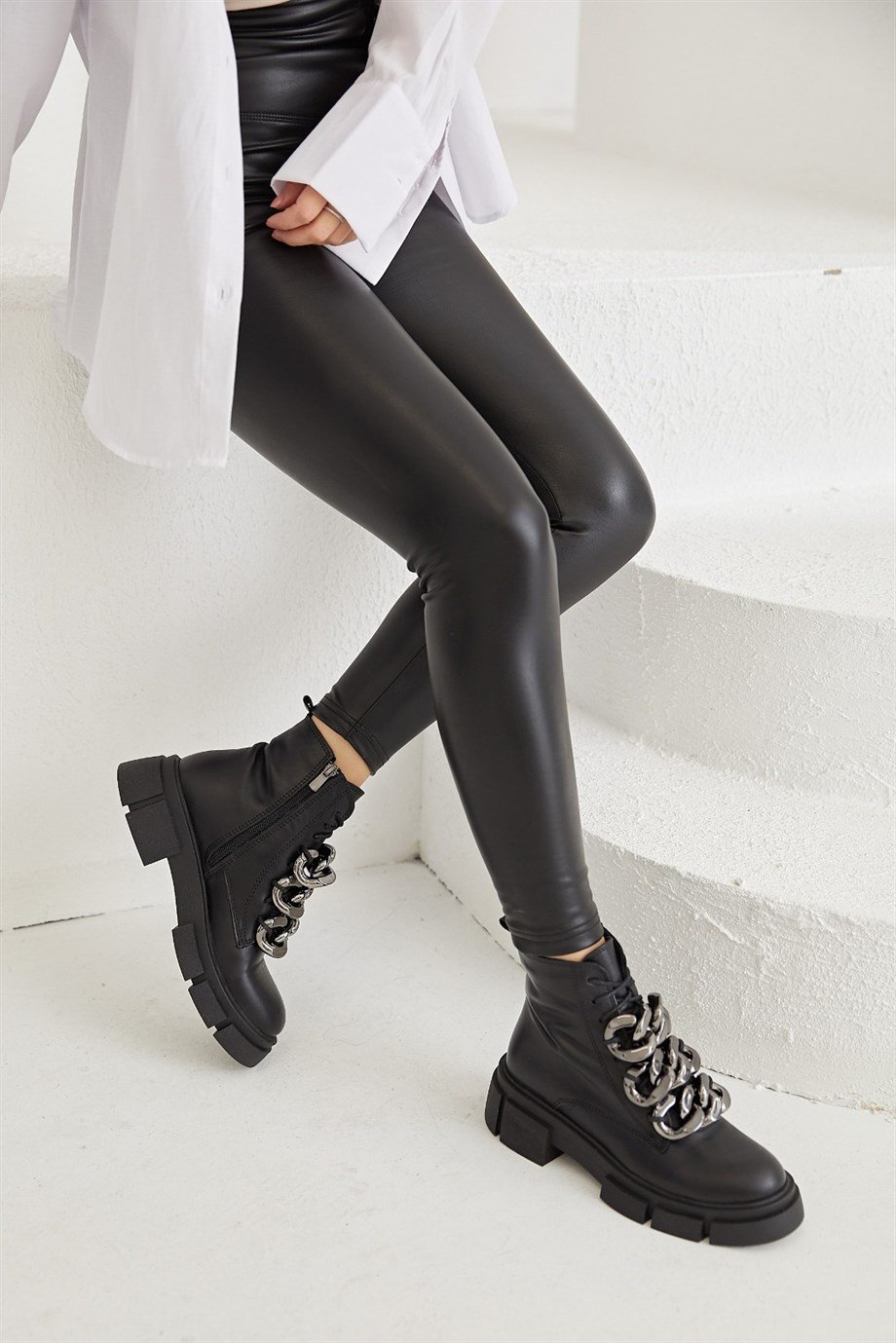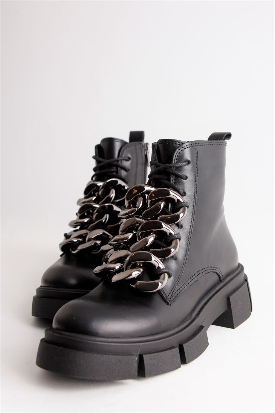 Women's Black Leather Chain Accessory Side Zipper Boots.
