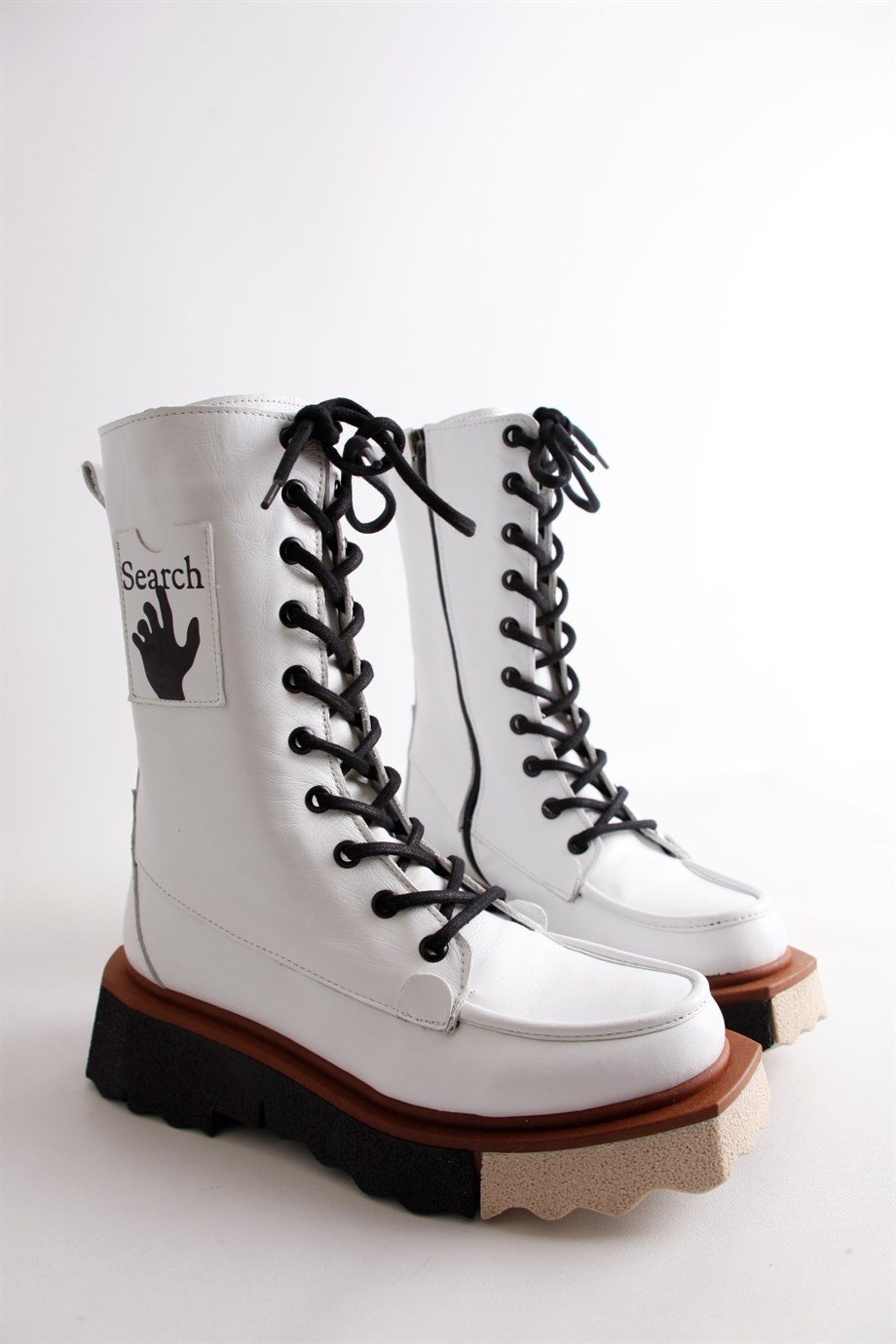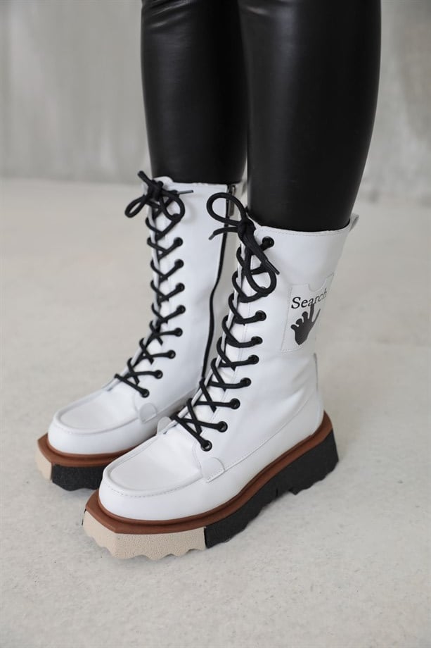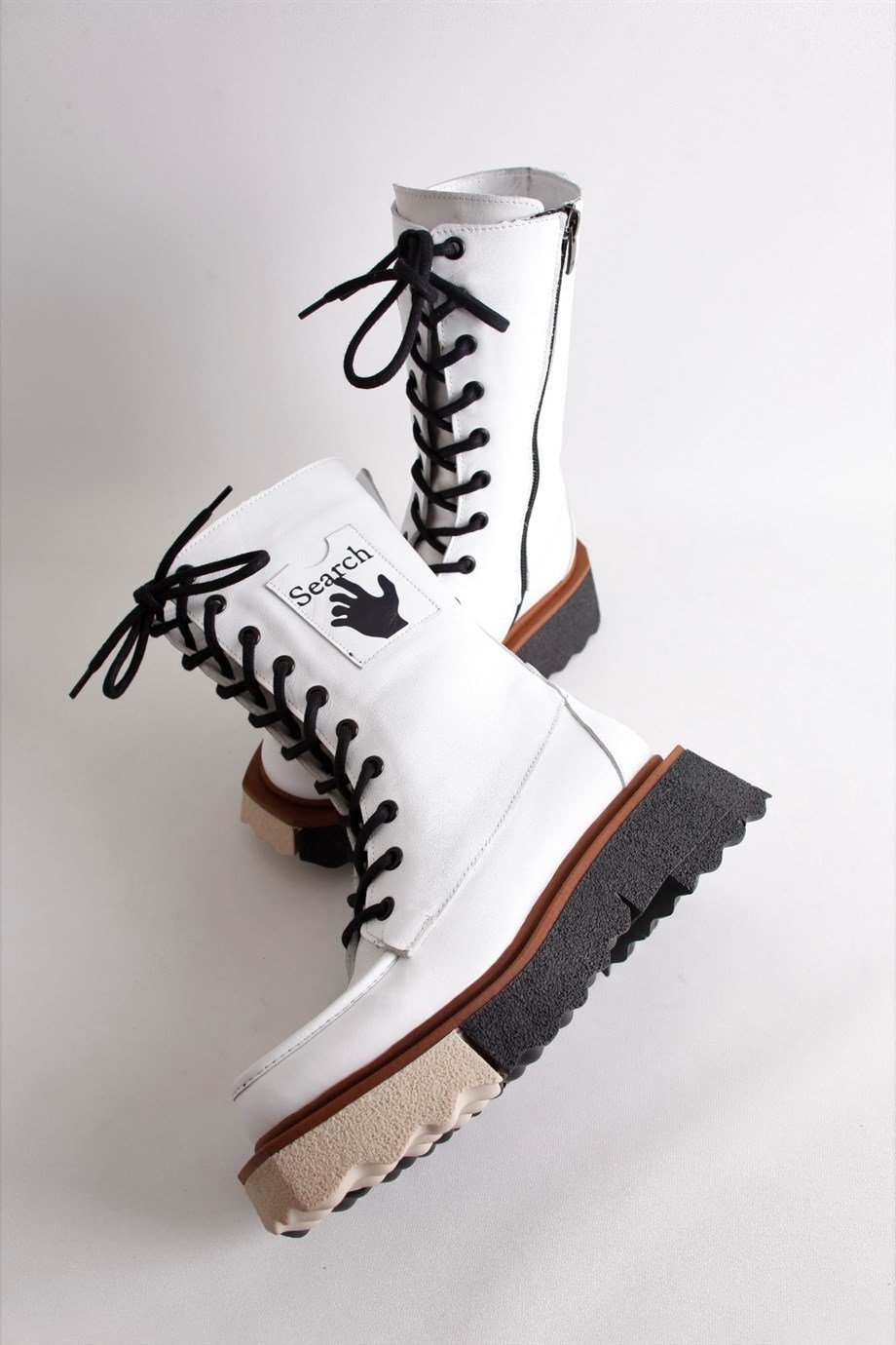 White Leather Lace-up Women's Boots with Zipper on the Side.