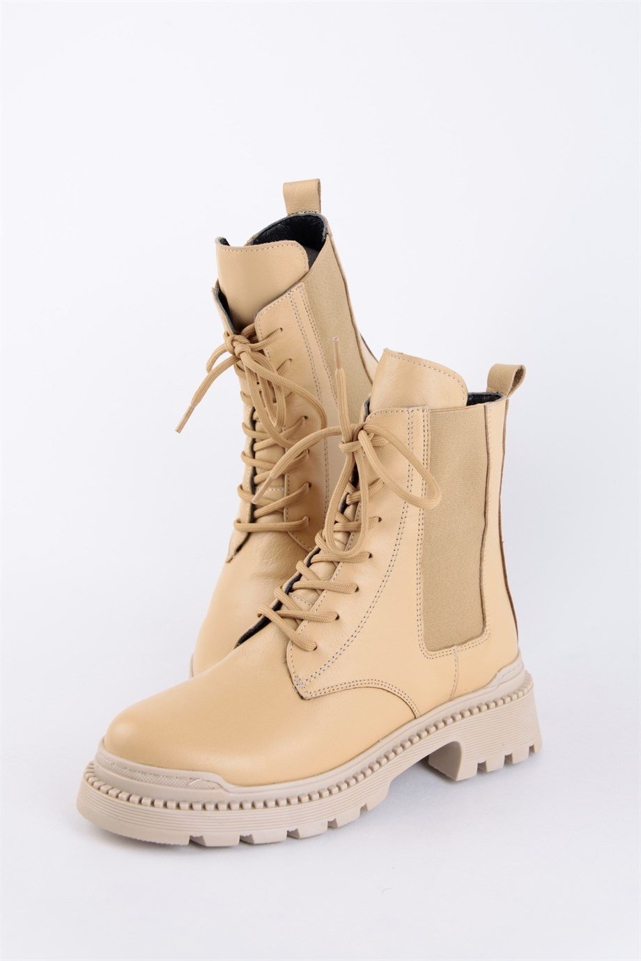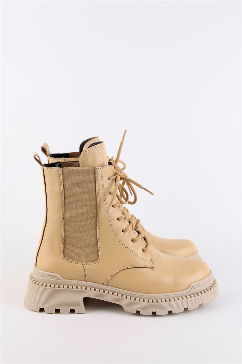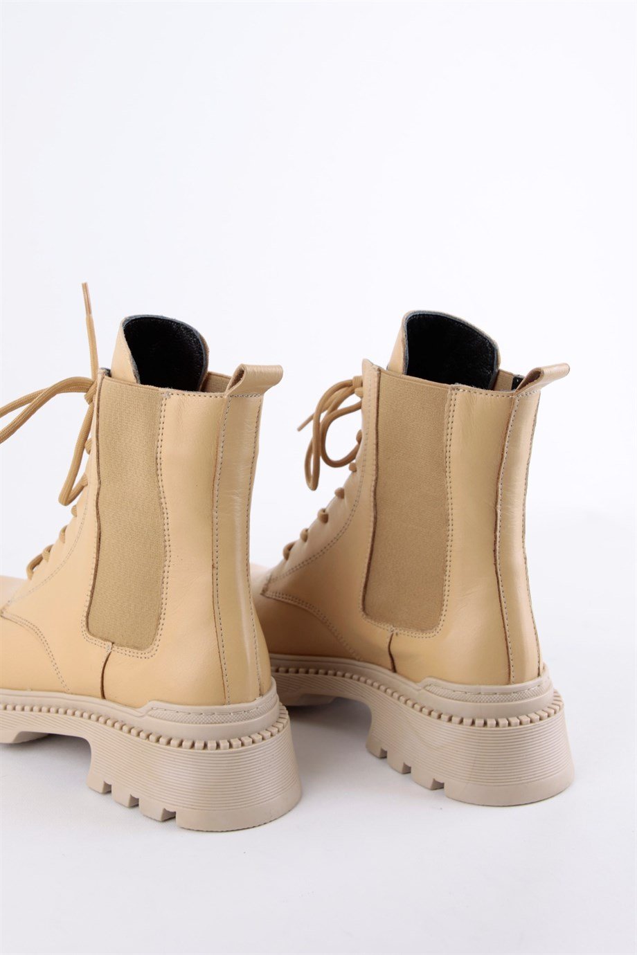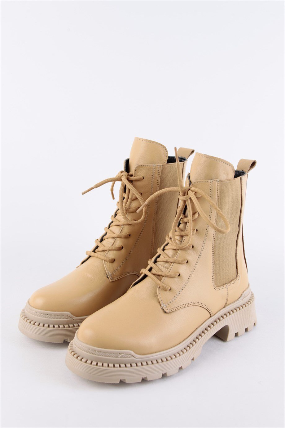 Nude Leather Sides Elastic Lace-up Women's Boots.