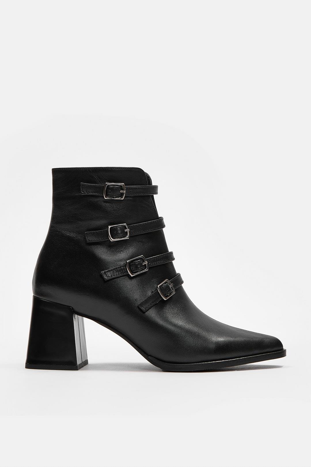 Siyah hakiki deri topuklu bot, kemer detayı ve 7 cm topuğuyla zarif bir şıklık sunar. Kaymaz tabanı ve el işçiliğiyle konforu lüks bir tasarımla buluşturur.
