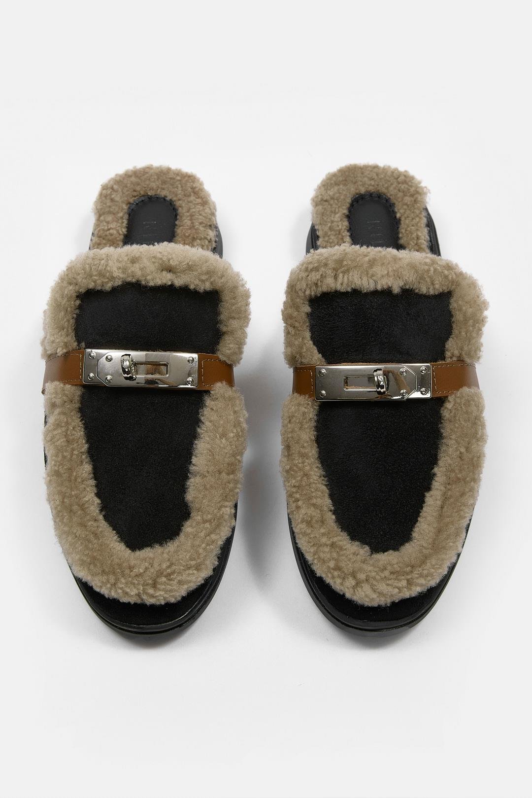 Siyah hakiki süet sabo terlik, ikonik kilit tokası ve gerçek kuzu kürkü astarıyla sıcaklık ve konfor sunar. Dayanıklı kauçuk tabanı ve el işçiliğiyle lüks bir şıklık kazandırır.