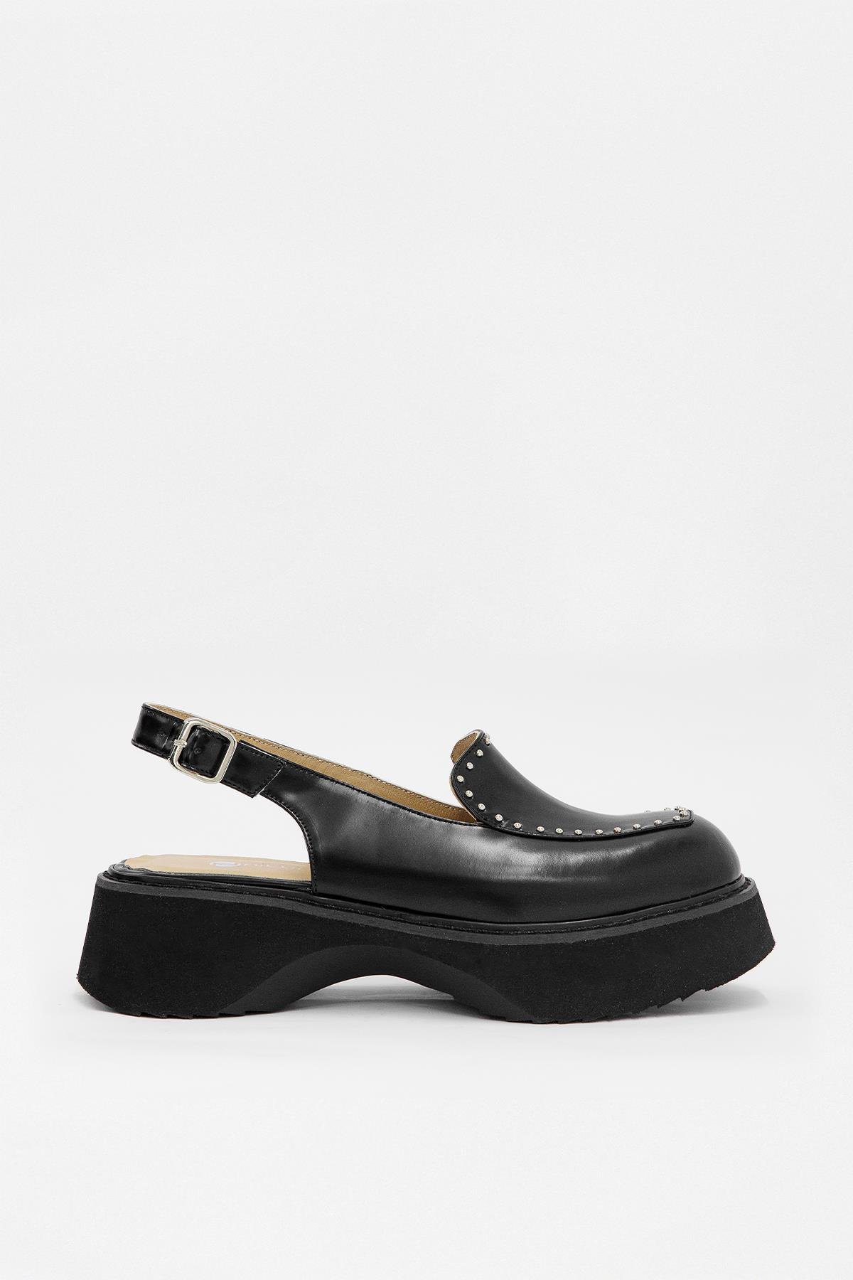 Siyah Hakiki Deri Ön Kısmı Trok Detaylı, Arkası Açık Ayarlanabilir Tokalı Kadın Ayakkabı