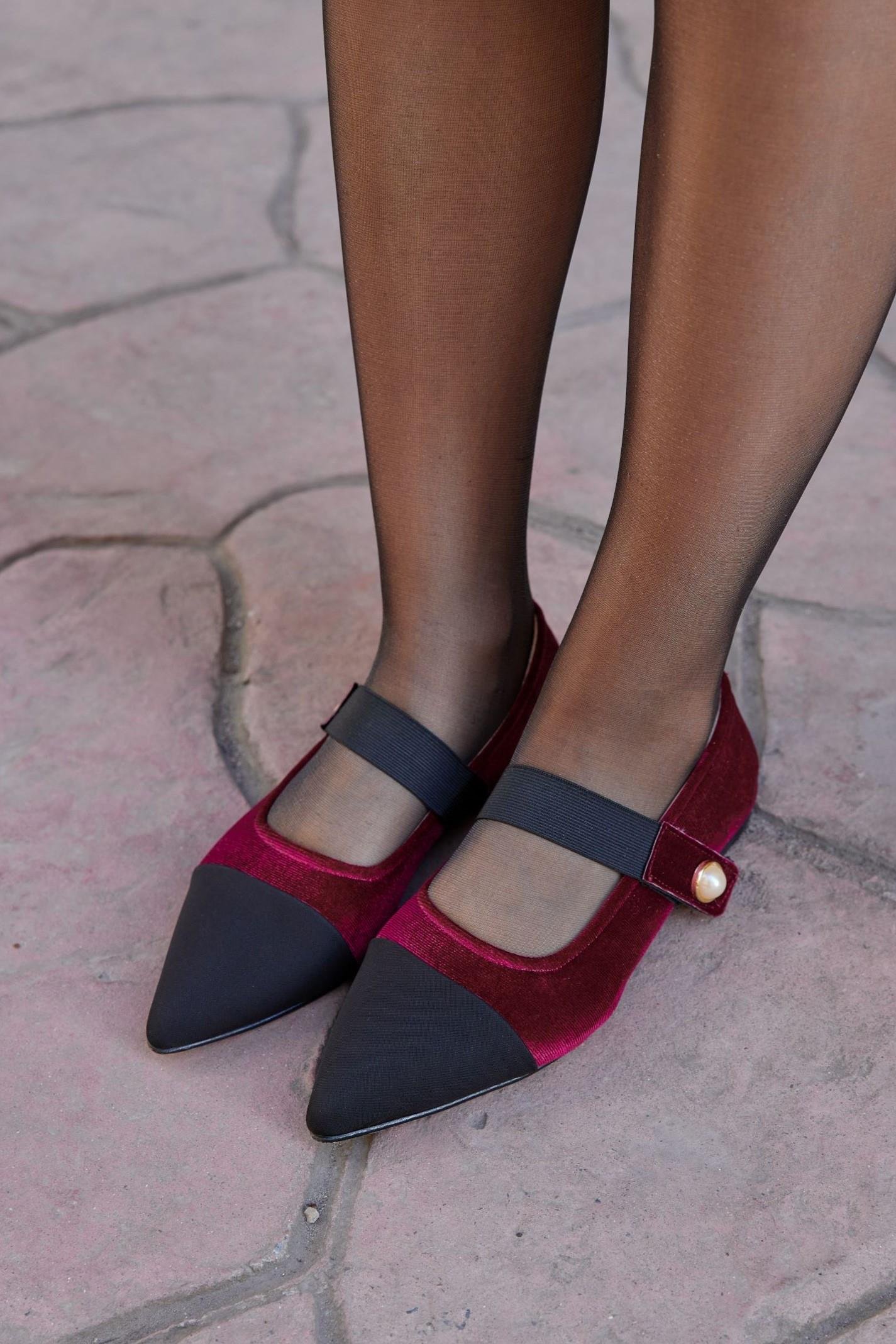 Bordo Renk Kadife Kumaş, Sivri Burunlu Burun Ucu Siyah Tekstil Kumaş Lastik Bantlı İnci Detaylı Kadın Düz Babet