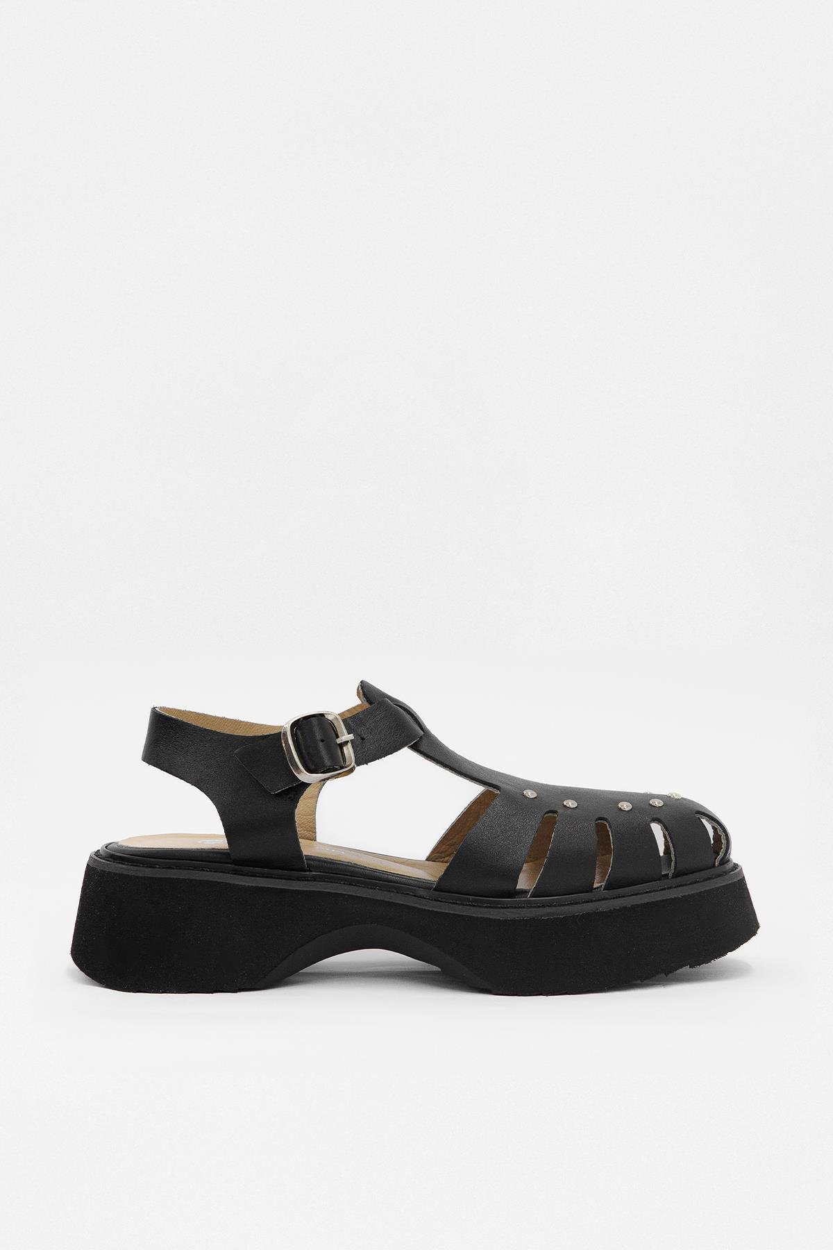 Siyah Hakiki Deri Ön Kısmı Trok Detaylı, Arkası Açık Ayarlanabilir Tokalı Kadın Ayakkabı