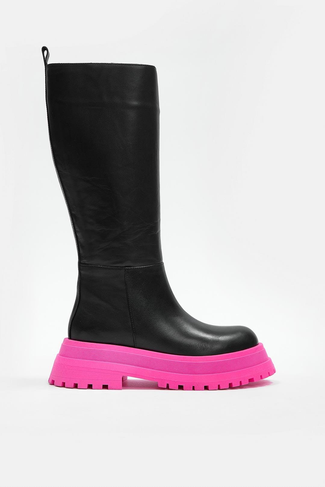 Siyah Hakiki Deri, Fuşya Kalın Tabanlı Yandan Fermuarlı Kadın Çizme.