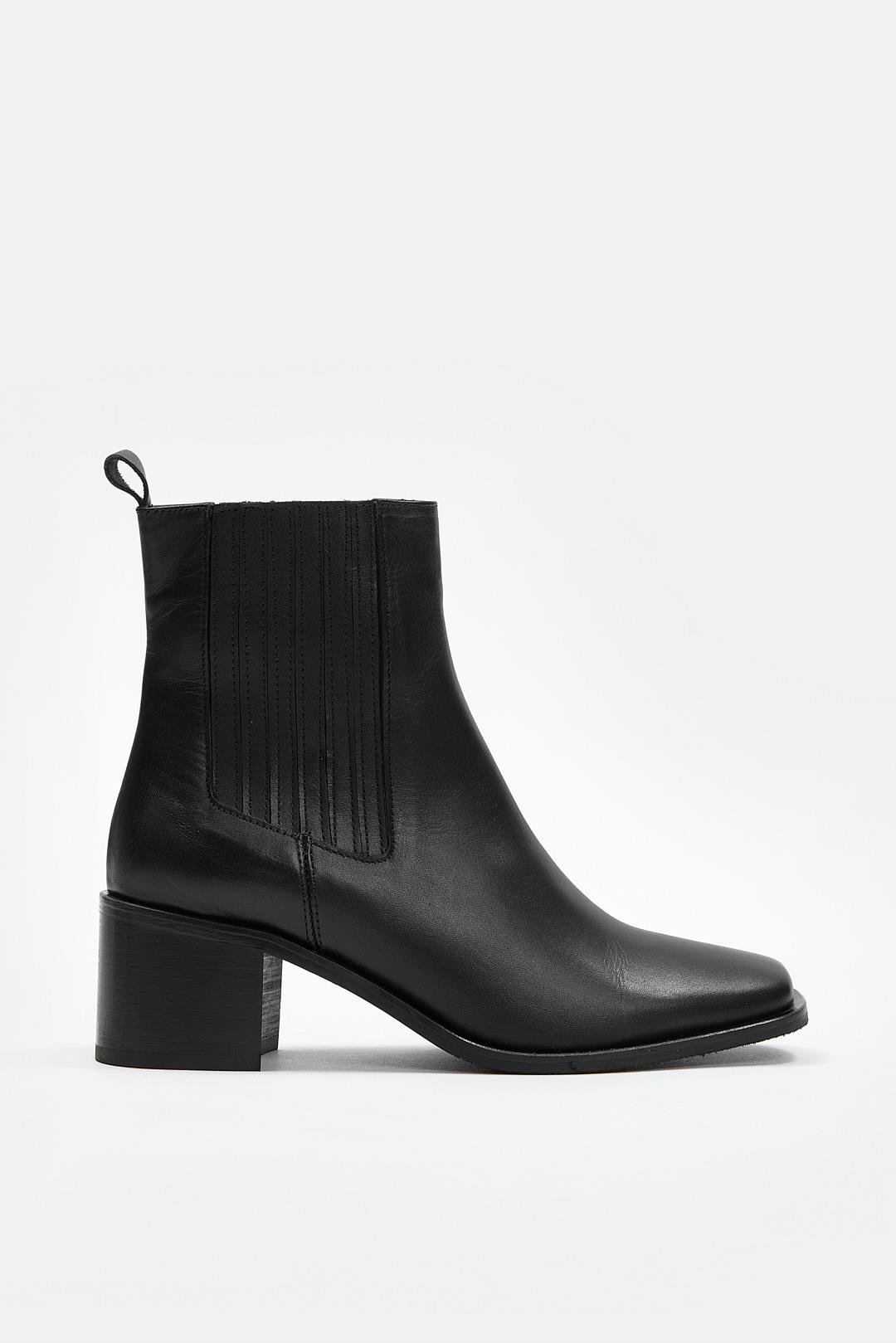Siyah hakiki deri, yan kısımları lastikli küt burunlu topuklu kadın bot. Zarif tasarımı ve üstün kalite el işçiliğiyle şıklığı ve konforu bir arada sunar. Tüm ürünlerimiz, sadece birinci sınıf kalite deri ile üretilmektedir.